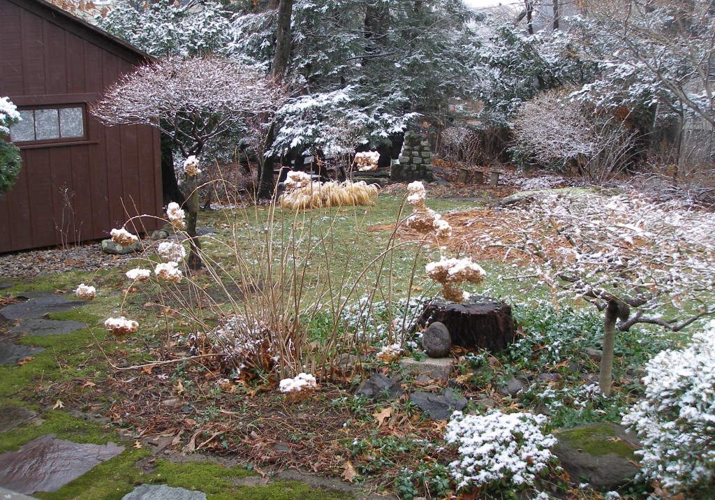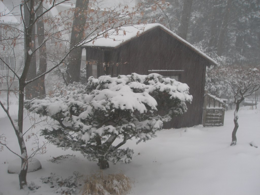 Reviewing photos taken over the years of my personal attempts at a Japanese inspired tea garden made it clear how many different wonderful effects are possible – from delicate dustings to deep mounds of snow left by blizzards; from branches outlined by or weighted down and drooping with damp clinging snow.