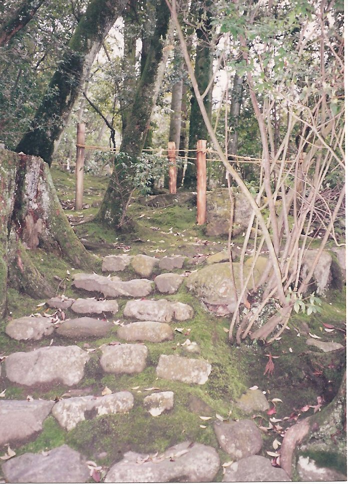 Upon reflecting back upon the many experiences of the trip, perhaps the least expected was the depth of my response to specific areas of Shinto shrines. These sites were not gardens but ancient sacred sites. Stone steps set in the earth led up a short way into the woods to a small square space marked off with a simple straw rope. Within this space was a low boulder.