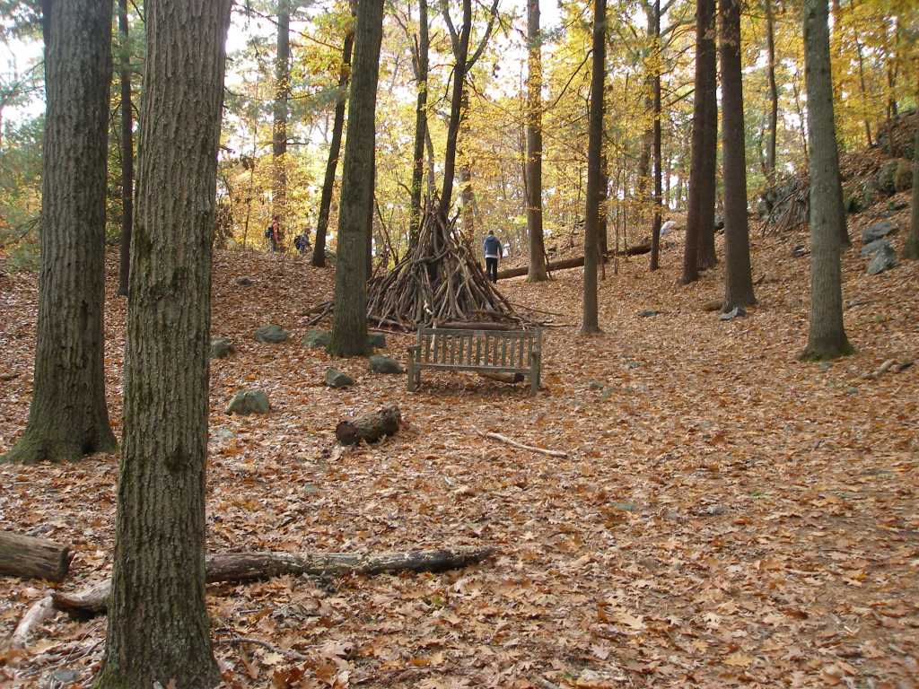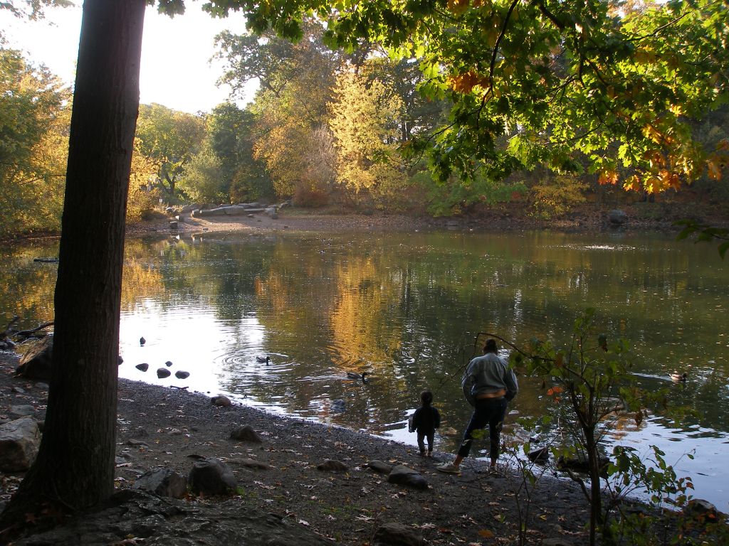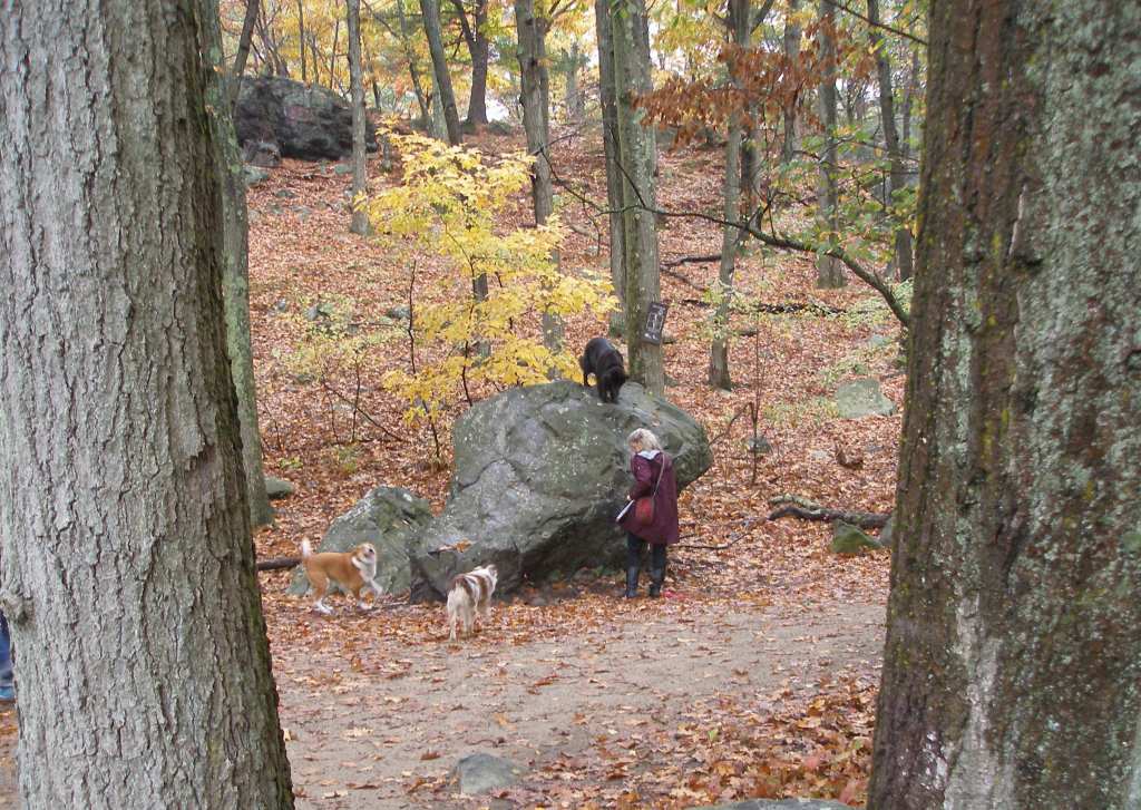 Continuing down the sidewalk, I come to Menotomy Rocks with its glacier-carved granite outcrops rising here and there. Fallen logs molder on either side of a wide path as yellow leaves glow on the living trees. Dogs seem to love it here and families come down to watch ducks swimming through vivid reflections.
