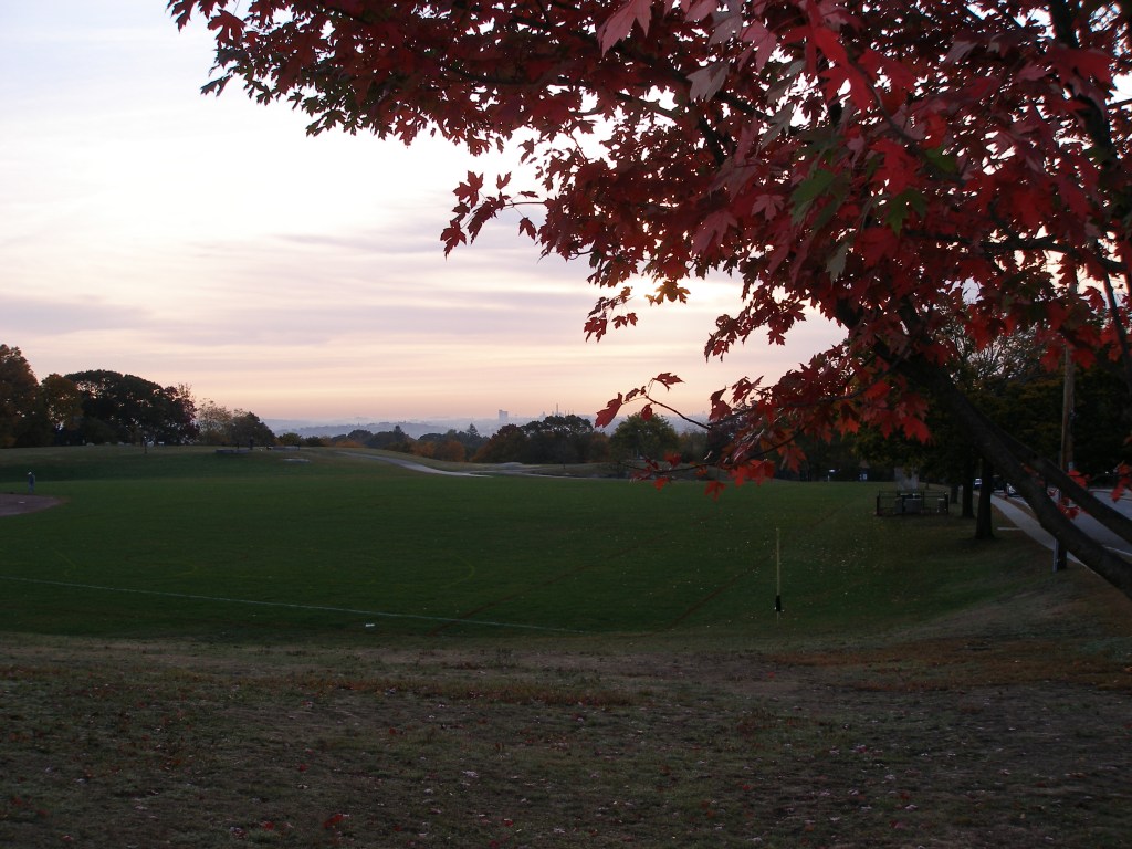 As I approach, Robbins Farm Park has a view of soft pinks over Boston framed by deep red leaves. Dogs romp as their owners call out greetings, recognizing each other despite their masks. A playground attracts a few children with its long slide and harvesters in the community garden seem most appropriate for a park that was once a farm.