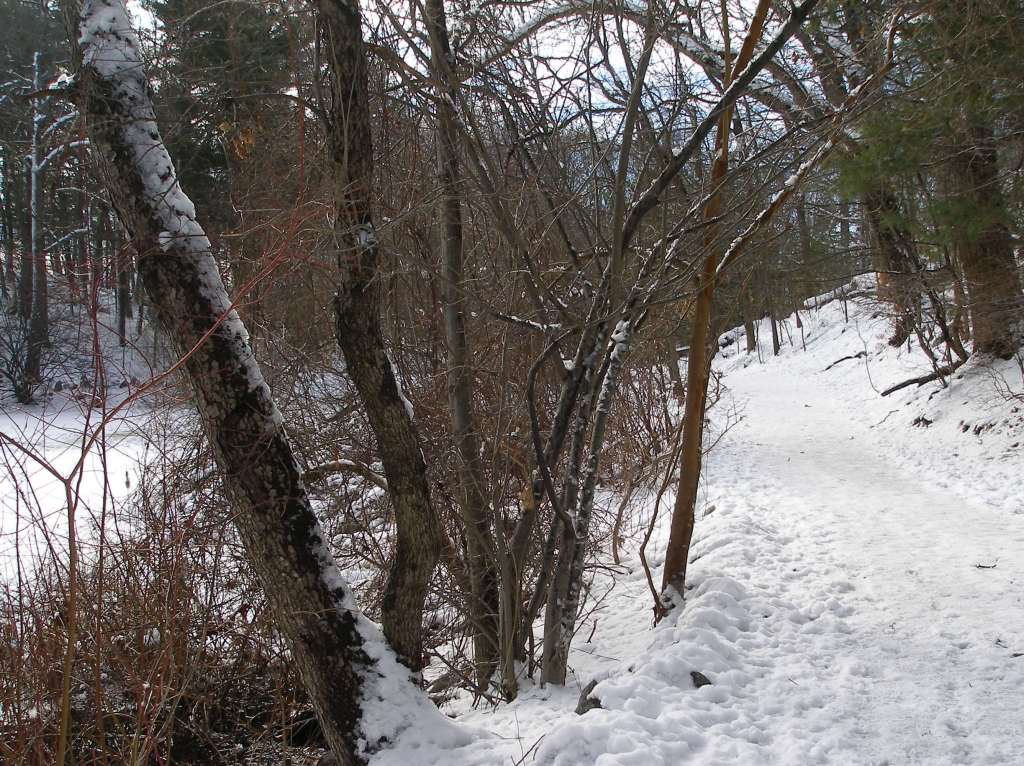 The pond was covered with snow during my last few walks. It was popular now that the ice was thick enough to be safe. But the path around the pond had been compacted to ice which made for slippery walking.