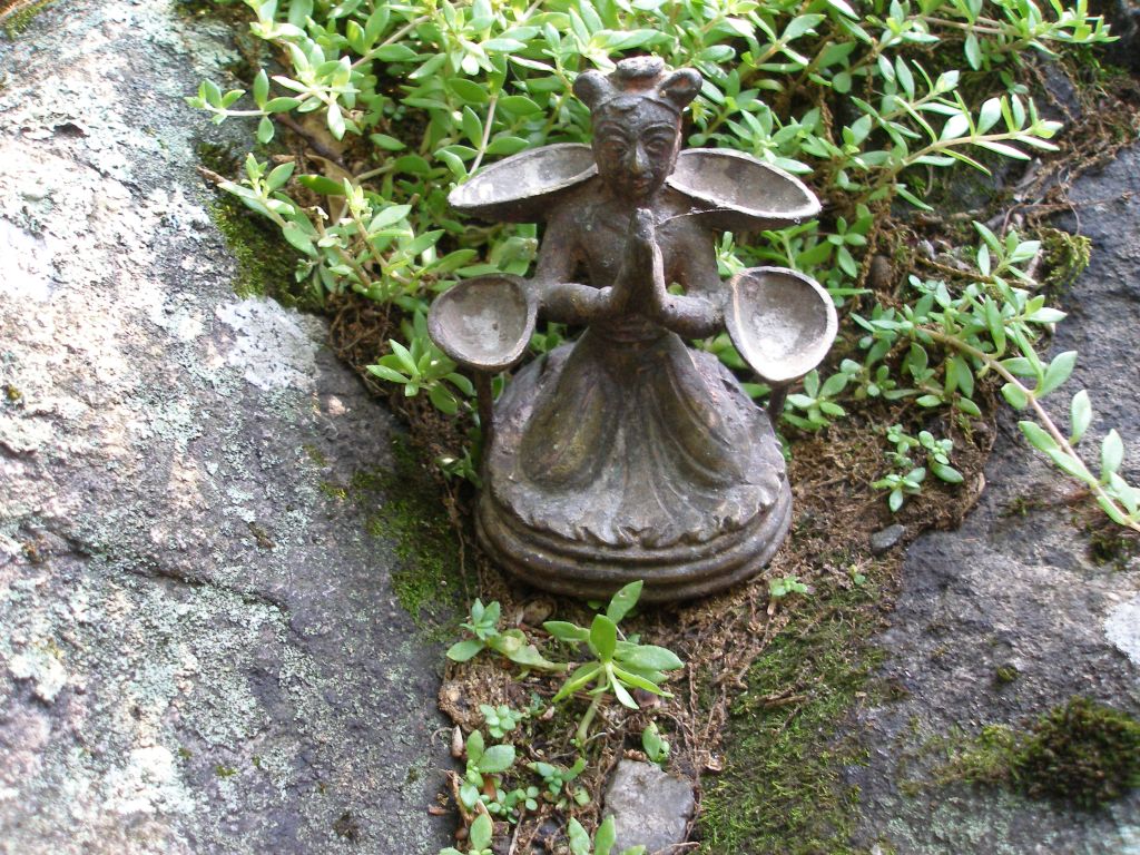 Anthropomorphic figures like the one to the right are found outside temples, near springs, guarding bridge entrances and on rooftops in western Nepal. In Wood Sculpture in Nepal, Jokers and Talismans, Bertrand Goy and Max Itzikovitz write, “very few serious and thorough scientific works (are) available to help us make sense of the scattered, fragmented and often conflicting information on these sculptures” (p 49). Scholarly works tend to discuss religious objects from the Kathmandu valley like the idealized donor lamp in the second photo.
