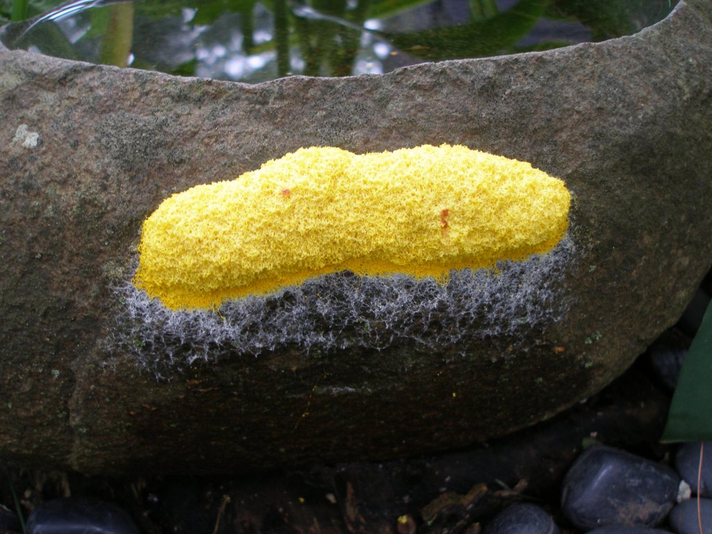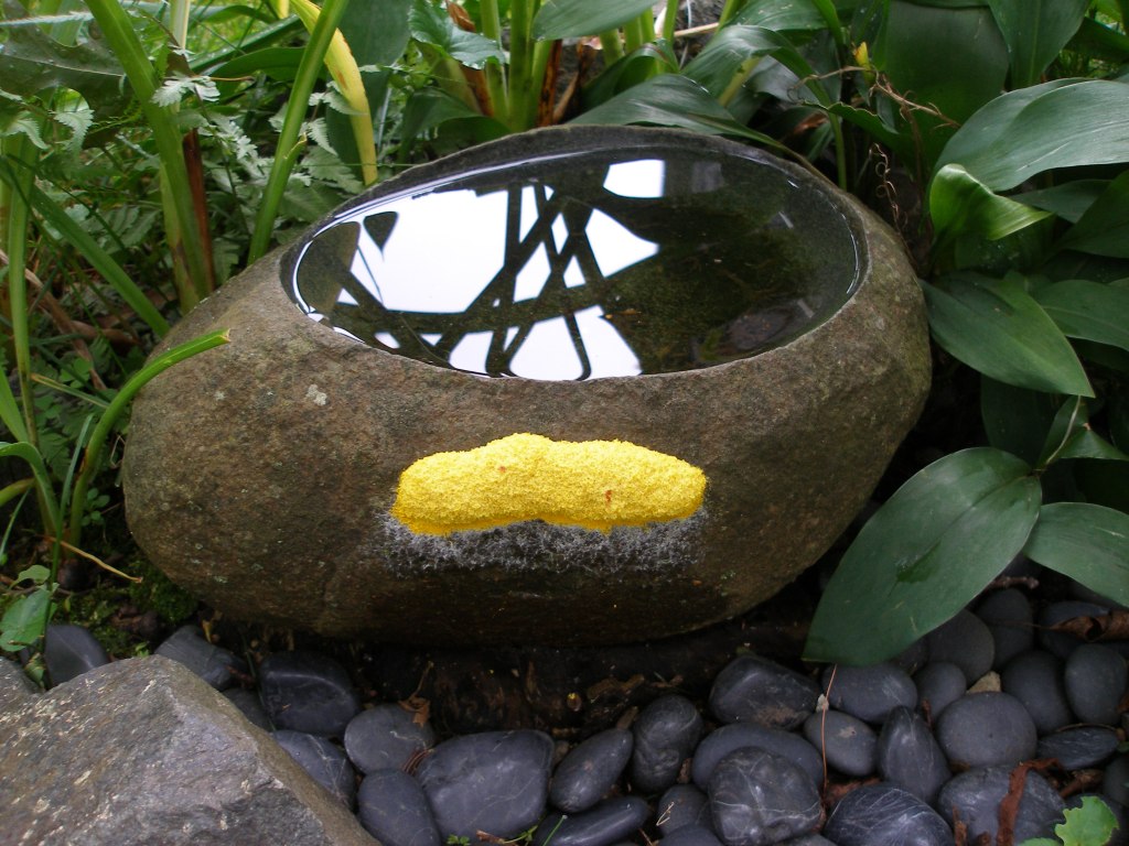 Spending more time observing nature has provided me with opportunities to observe examples of intelligent adaptation up close. When a yellow patch moved up the side of a small basin, I thought this must be a slime mold. These wonderful beings that are neither animals nor plants, make intelligent decisions. After a series of rainy days, this fuligo septica had found a suitable dry place to make a fruiting body and release spores.