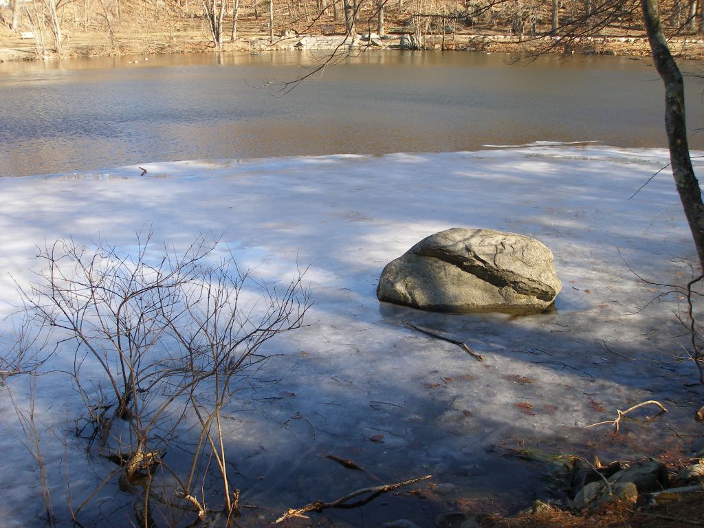 A boulder perched at the edge of Hills Pond when I started the photo series. It became an island as the waters rose. Then ice linked it to land again. In spring, geese and ducks perched on its strong back. There were signs of trouble as algal bloom sullied the water and all the birds left.