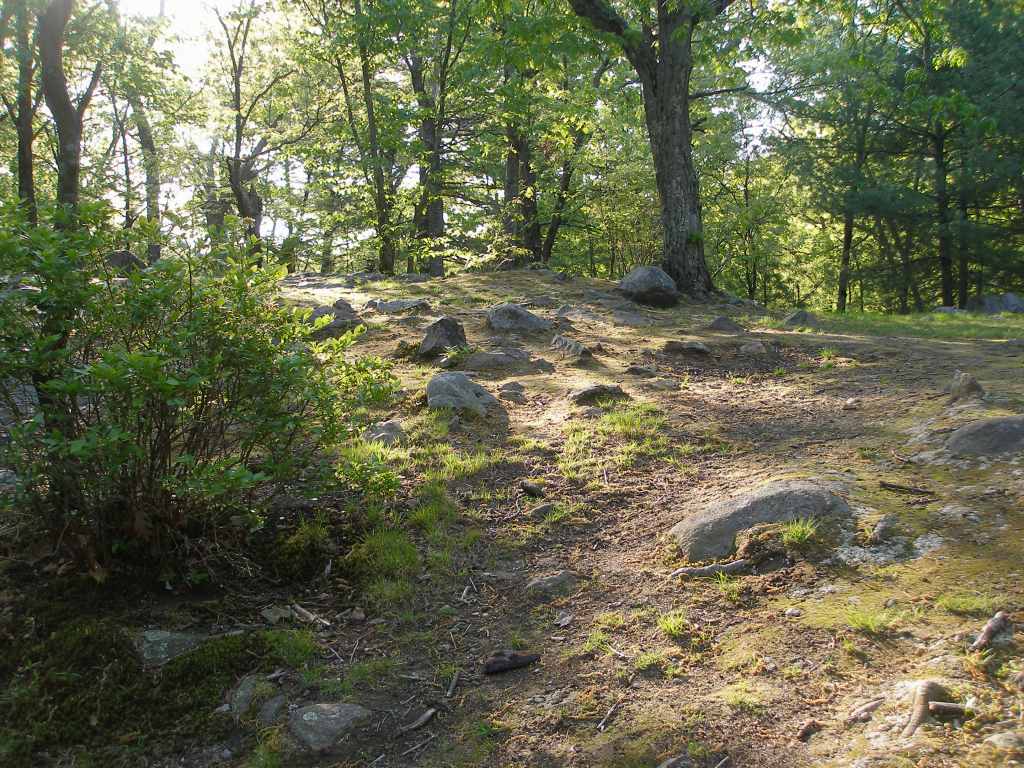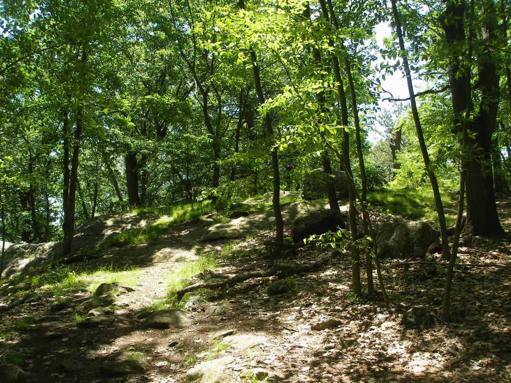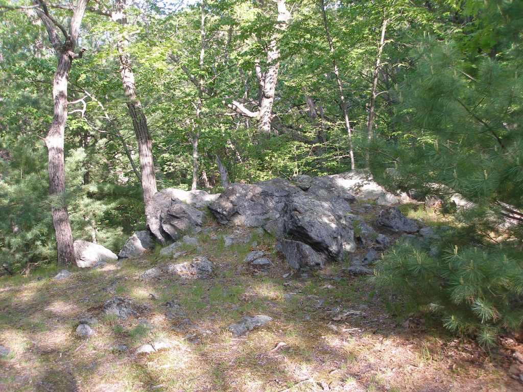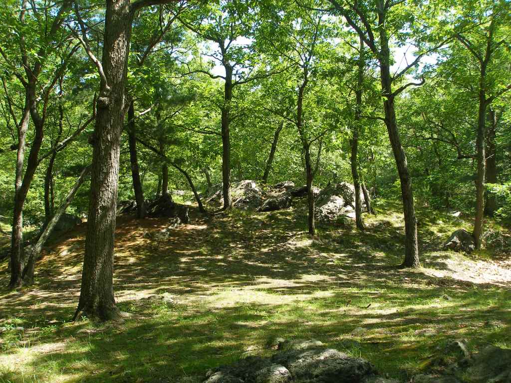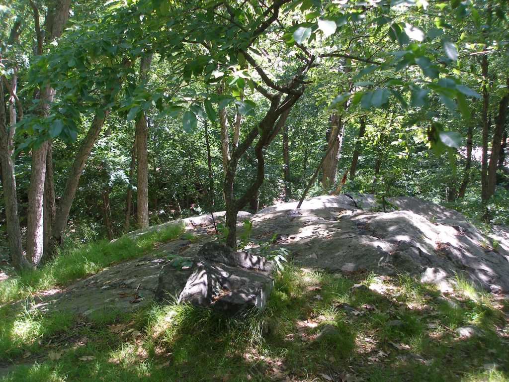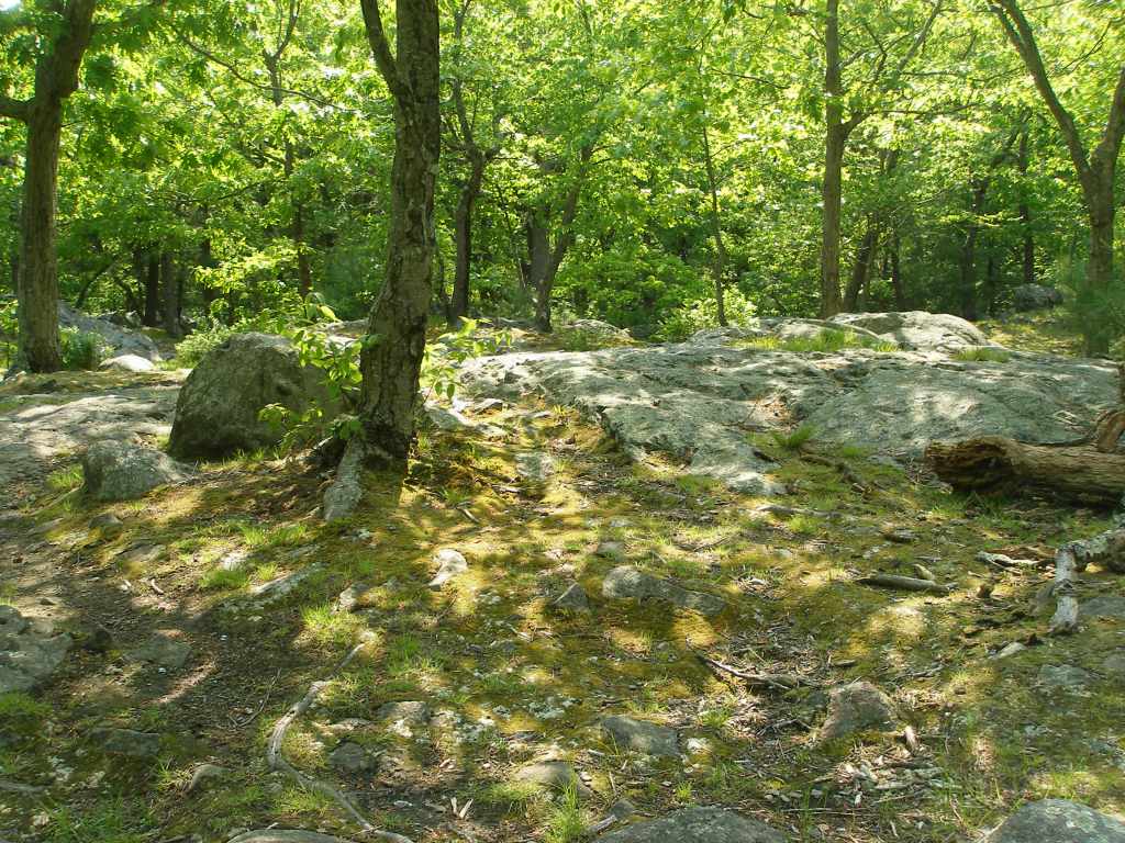 Trees have taken root among the moss and lichen-covered granite outcrops in a secluded high spot in Menotomy Rocks Park. There are wide open spaces between patches of vegetation where the soil is deep enough to support larger roots.