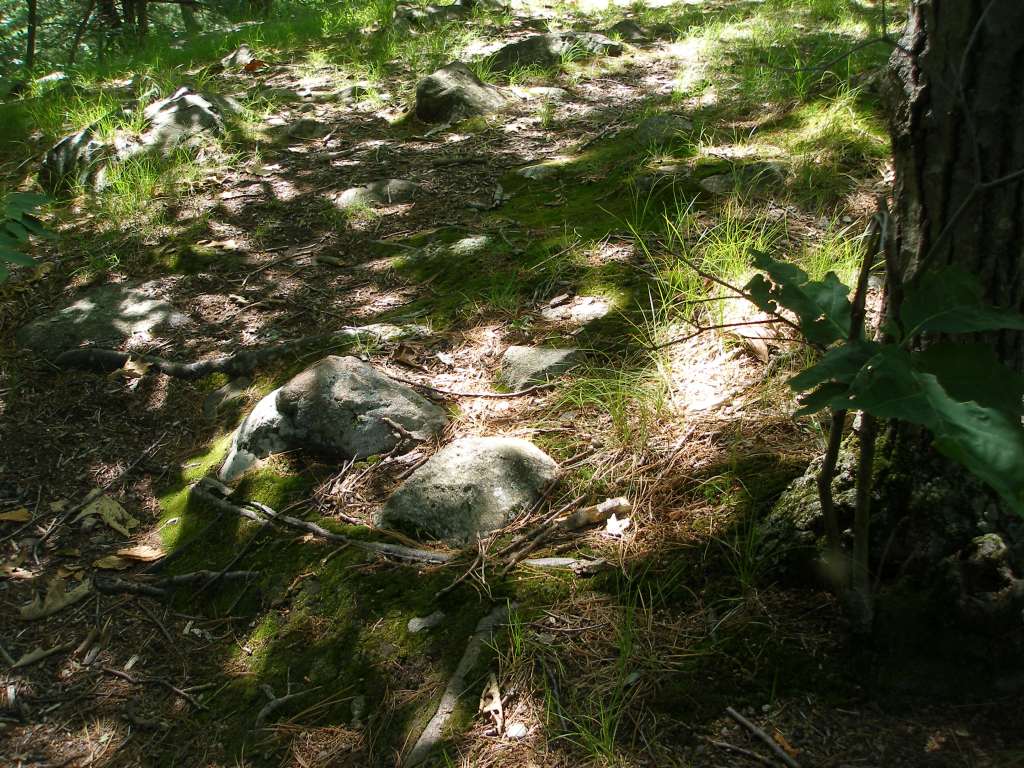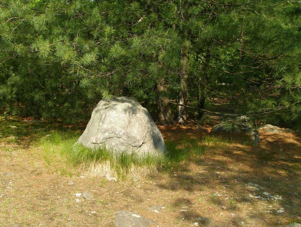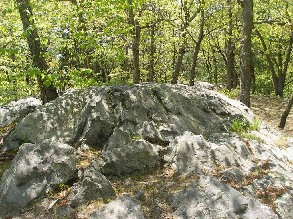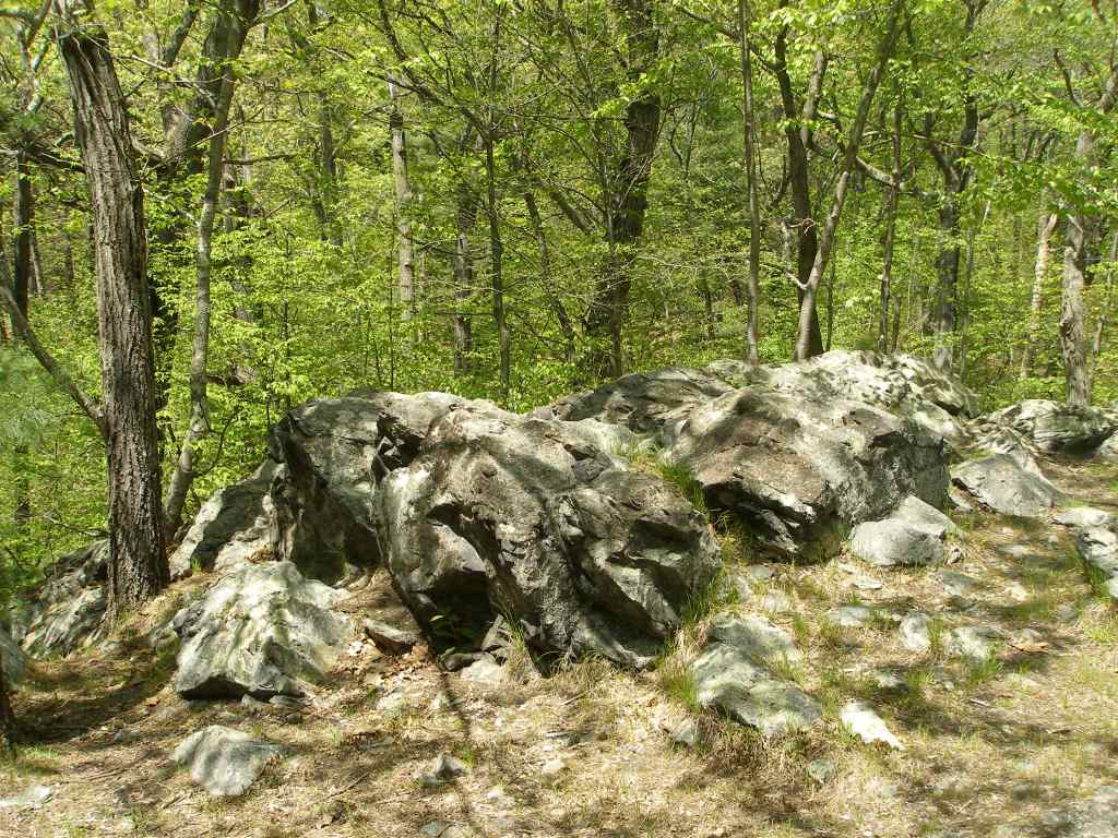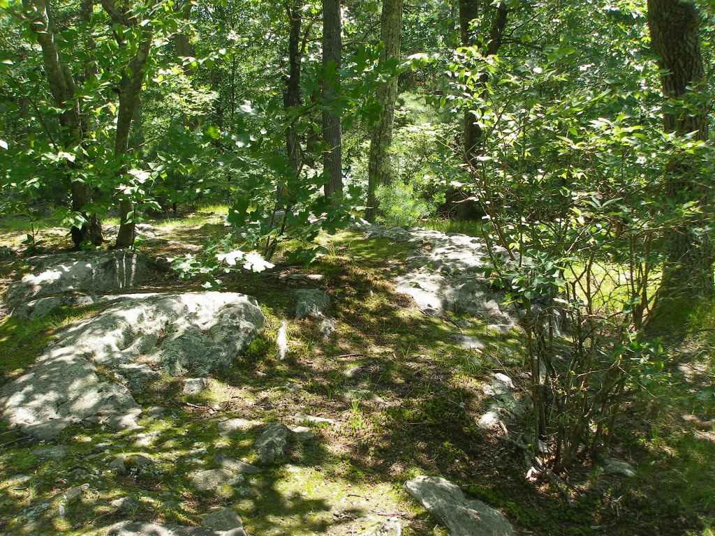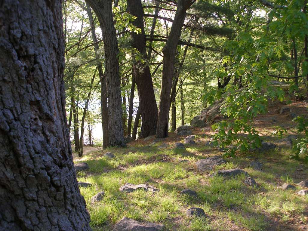 Trees have taken root among the moss and lichen-covered granite outcrops in a secluded high spot in Menotomy Rocks Park. There are wide open spaces between patches of vegetation where the soil is deep enough to support larger roots.
