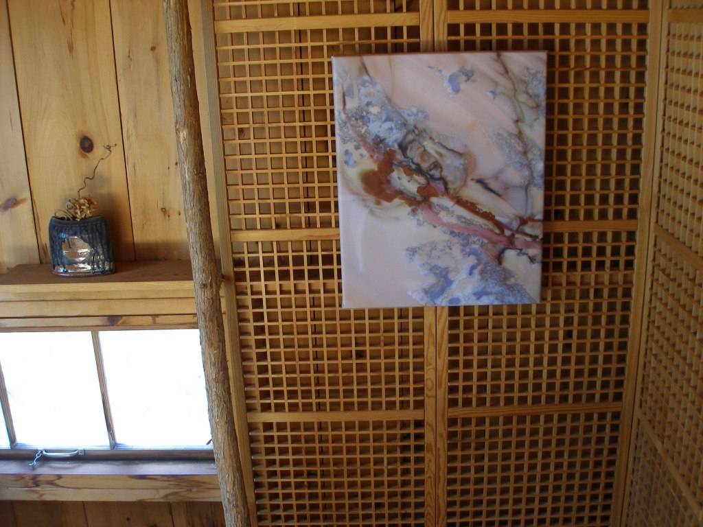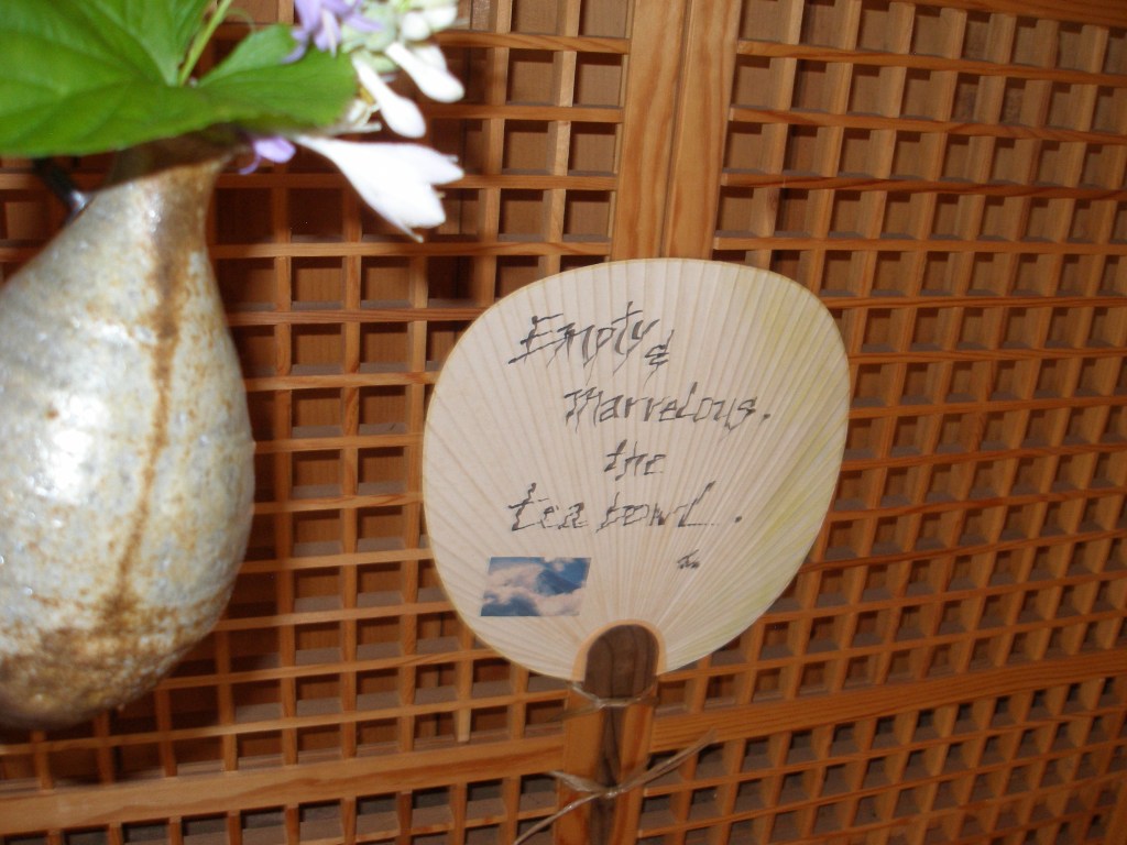 Among the more unusual art displays in the photos below are a paper fan with words added by a fellow tea ceremony student, an enlargement of a small section of morrisonite jasper, and a photo of my recreation of a falling apart well in New Hampshire that I put in a tucked away part of my tea garden.