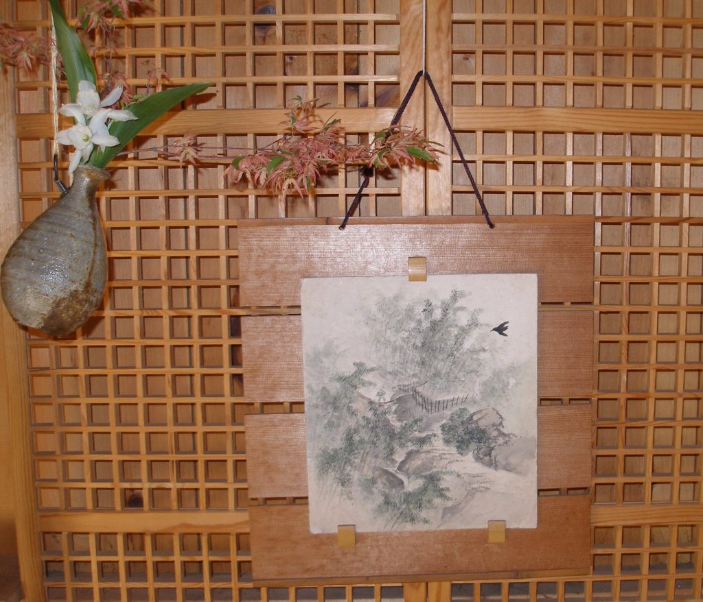 I was lucky to locate a lovely unfinished pine screen that seemed perfect for displaying art and flowers in my garden shed tea hut as a screen is an acceptable alternative to the more typical tokonoma alcove found in larger tea huts. The board under the screen was a special gift from my sister.