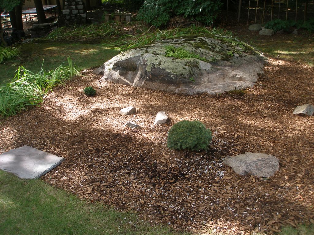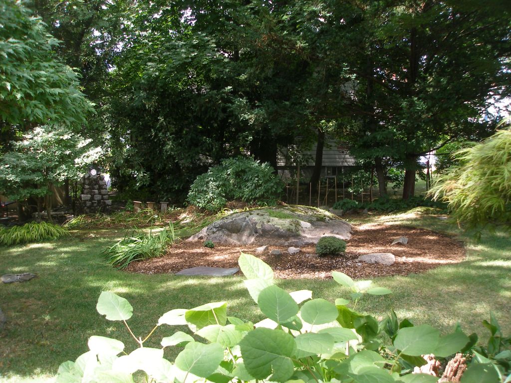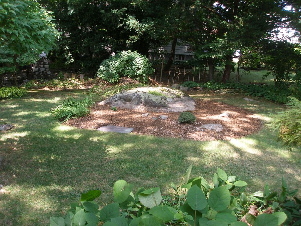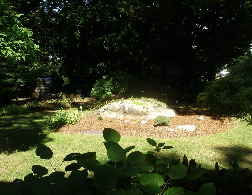 Shadows move across the large granite outcrop in my backyard creating quite interesting effects now that I can see them more clearly. I decided to plant two tiny evergreens where irises once grew. There are some initial signs that they like the spots that I chose for them, but only time will tell.