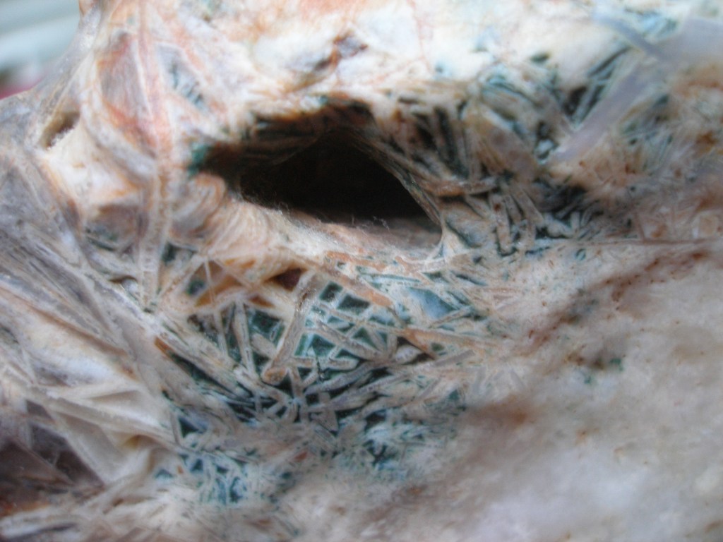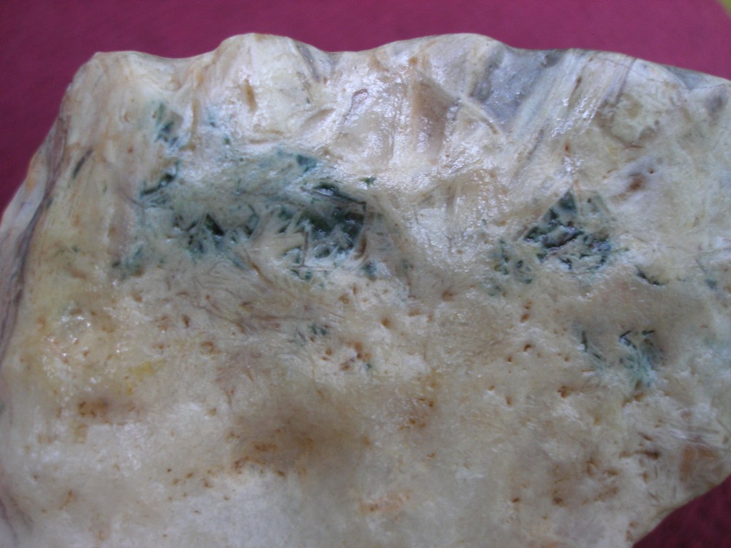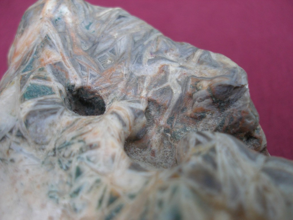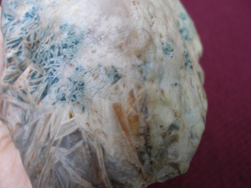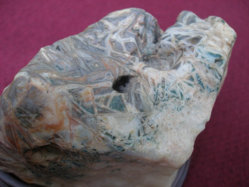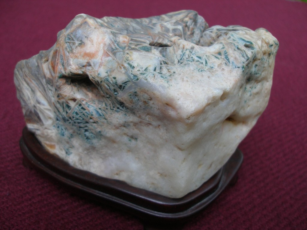 This Gobi Dessert scholar’s rock that always keeps me company as I work at my desktop computer is rather small, just 5″ by 2 1/2″ (13 x 6 mm). In overall shape it resembles a cliff. But it is the colorful pattern of intertwined crystals “growing” out of a white base that really makes it special. This type of microcrystalline quartz is sometimes referred to as “Chopstick lattice agate.” But to me this one looks more like densely tangled grass.