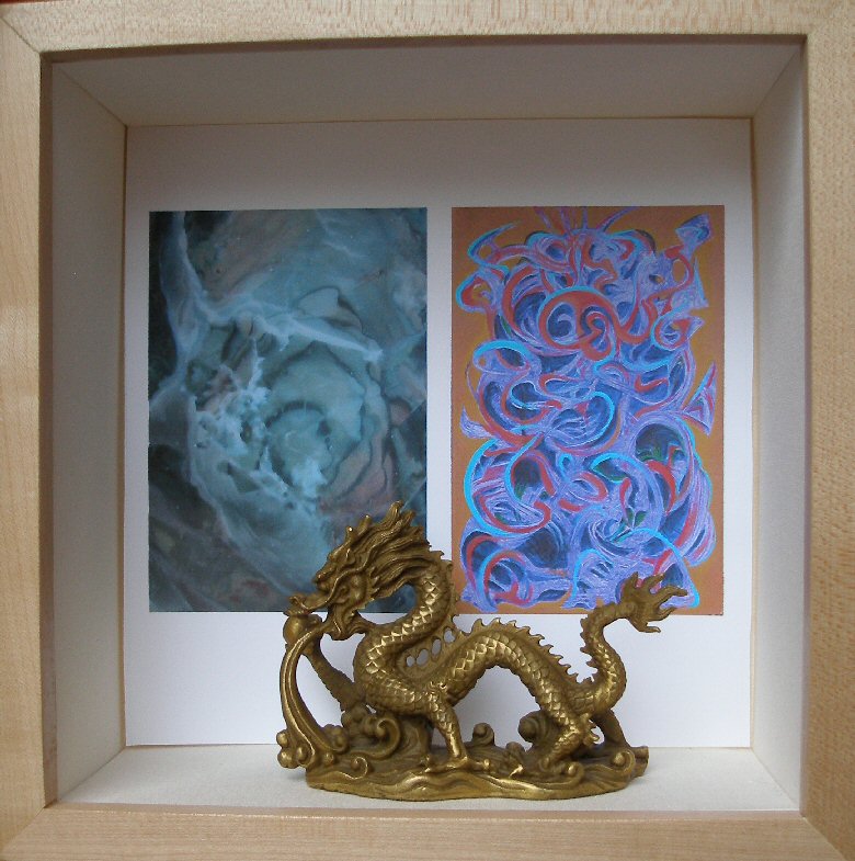 Thom Lane created a painting inspired by the dragon energy he found in a Morrisonite slab. A closeup of the dragon image in the slab and a photo of Thom’s painting were used side by side in a shadow box that I created for an article I wrote on using shadow boxes to tell stories about stones.