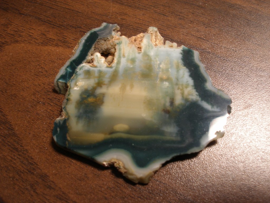 A small Blue Mountain jasper slab has a whole scene – a hut beneath some trees on the lower right and an oval (dragon egg?) by what appears to be a body of water.